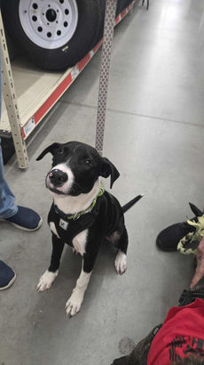 Apollo is the kind of pup who captures your heart the moment he looks up at you with those big, soulful eyes. With his adorable pink-flecked nose, striking black-and-white coat, and gentle, curious demeanor, this handsome youngster is the full package — sweet, smart, and ready to shine.